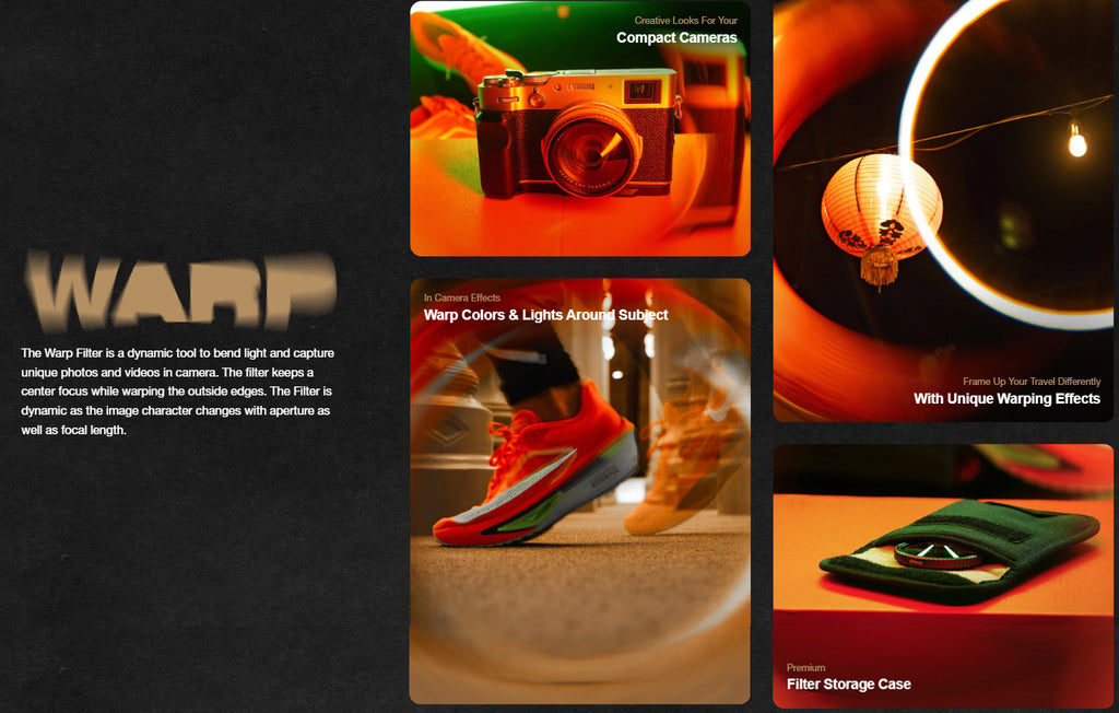 The Warp Filter is a dynamic tool to bend light and capture unique photos and videos in camera. The filter keeps a center focus while warping the outside edges. The Filter is dynamic as the image character changes with aperture as well as focal length.
