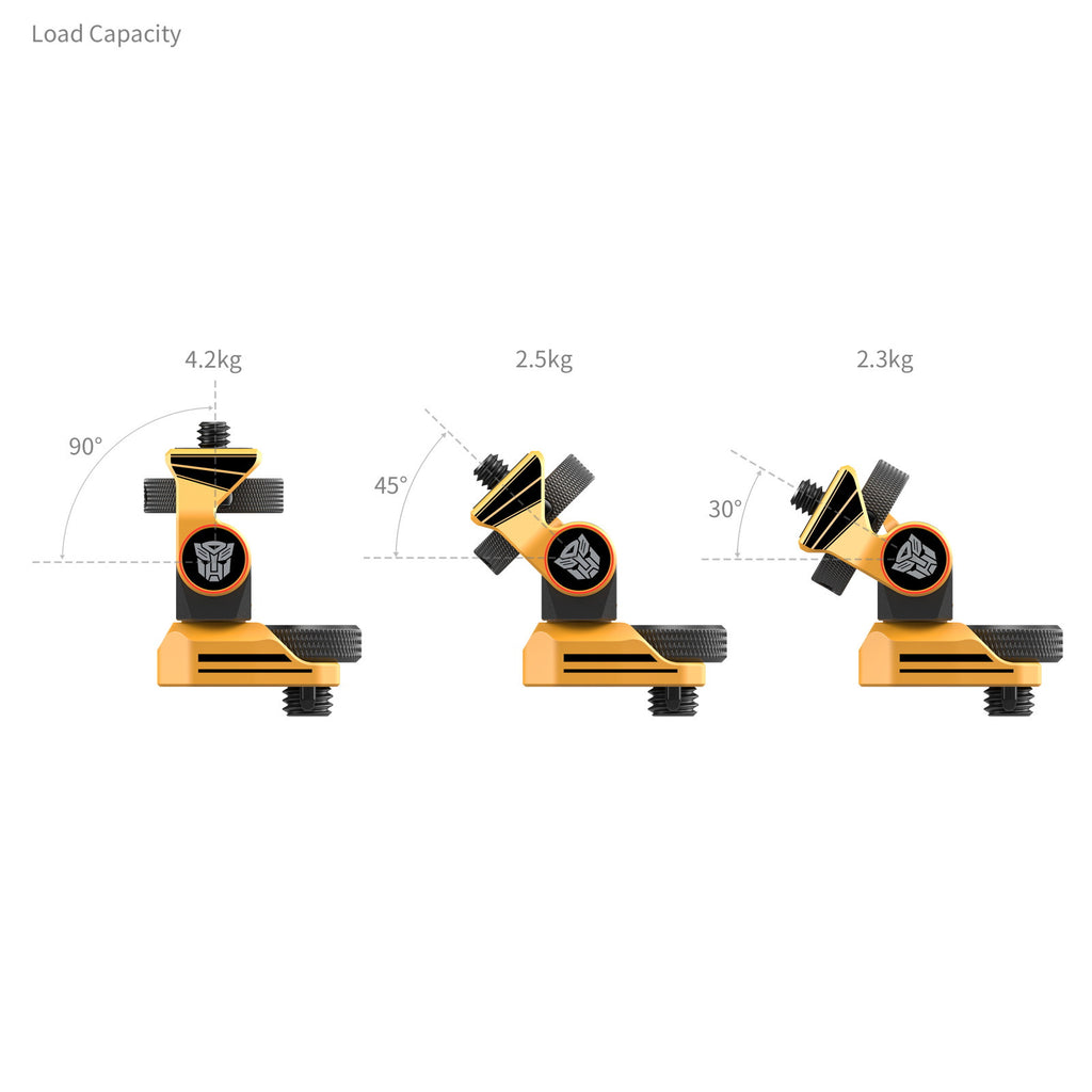 SmallRig Adjustable Monitor Support Compatible with ARRI 3/8''-16 Screws (BumbleBee Edition) 5520 is designed to hold your monitor for easy monitoring. It comes with a bottom ARRI locating screw for accessories with ARRI 3/8" -16 locating holes and a top 1/4"-20 screw for monitor, microphone, light, etc. The mount can tilt 180° and and swivel 360°. Its tilt axis is quickly tightened via a knob to suit different weight and features tested durability, with tilt load capacity decreased by no more than 20% after 10,000 tilts, while its pan axis is 360° adjustable via an Allen wrench. Bouncy locating pins on the top help secure Ninja V/ V+; and 1/4"-20 threaded holes at the bottom allow attaching Magic Arm 2070, etc. The thumbscrews have holes for Allen wrench to facilitate assembly and disassembly.