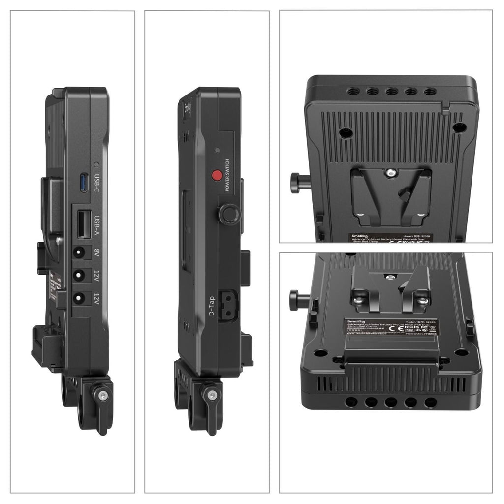 SmallRig Advanced V-Mount Battery Mount Plate with Dual 15mm Rod Clamp 3203B can quickly mount onto a 15mm LWS rod system. This item features a standard V-mount, compatible with most V-mount batteries on the market, six 1/4"-20 threaded holes and ten M4 threaded holes on the back, five 1/4"-20 threaded holes on the top and bottom, which support dual rod clamp and many other accessories. It comes with a PD protocol compatible USB-C input/output (65W Max.) port and a QC protocol compatible USB-A output (36W Max.) port for fast charging/discharging; a D-Tap input/output (14.8V) ports; and three DC output ports (DC5521 8V x 1 / DC5525 12V x 2). The power indicator light and charging/discharging indicator light indicates the working status and fast/slow charging mode; the power on/off button can simultaneously control multiple ports. Besides, the aluminum alloy plate has a comfortable texture, with wonderful heat dissipation performance and durability.