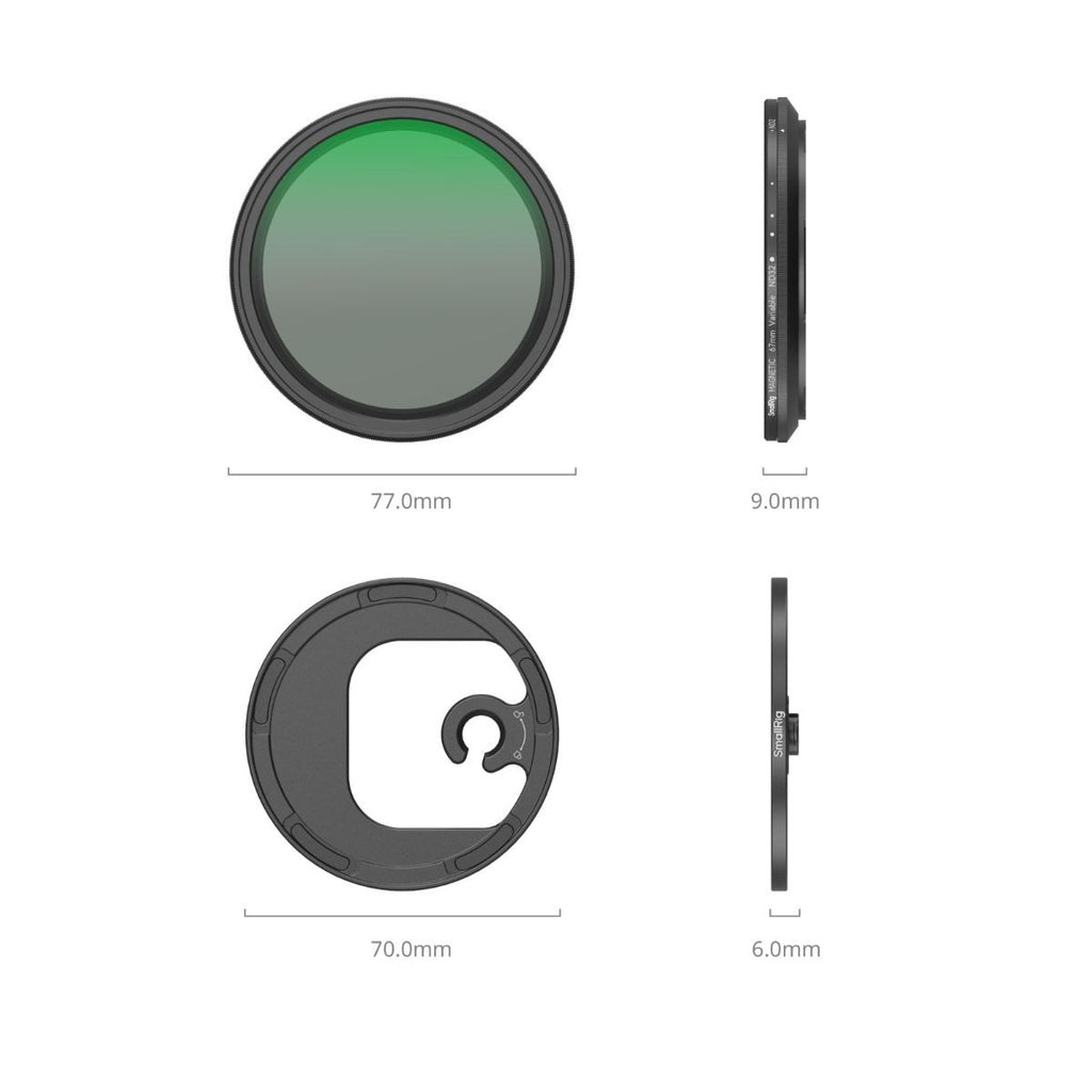 SmallRig Attachable VND Filter Kit ND2-ND32 (1-5 Stop) with M-mount Filter Adapter 67mm 4724 Through the VND filter with adjustable exposure reduction, users can flexibly utilize it in video shooting, providing them with reasonable exposure parameter settings and delivering more professional video footage. The multi-coated optical glass offers reliable optical quality, ensuring that the captured images are free from vignetting. The magnetic attachment system provides users with a fast and efficient experience for installing and replacing filters. The set includes an M-mount adapter ring for direct integration with the M-mount backplane on iPhone series cages. Equipped with the threaded adapter ring, the filter can be mounted on a 67mm camera lens, providing a convenient magnetic filter installation experience for camera lenses.
