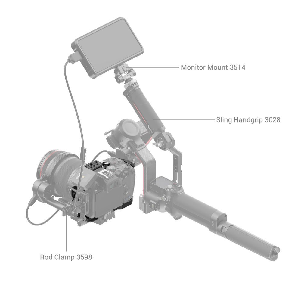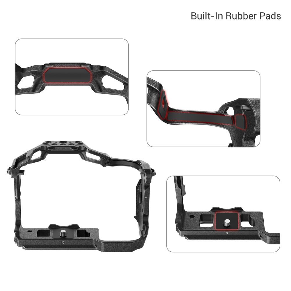 SmallRig “Black Mamba” Cage for Canon EOS R7 4003B is designed to provide protection and multiple accessory mounting points. Locking the camera via one 1/4 "-20 screw at the bottom and one side lock adapter on both sides, this cage features silicone cushions that prevent scratching and a “Black Mamba” style as a whole that gives full access to all controls of the camera. It also comes with 1/4 "-20 threaded holes and ARRI 3/8" -16 locating holes for Side Handle 2093 and 3814, Top Handle 3786 and 3765, Magic Arm 2070, Monitor Mount 2903, Holder for Portable Power Banks 2336, Rod Clamp 3598, etc.; Cold shoe mounts for attaching the microphone and LED light; NATO rails for Side Handle 3260 and 3813; and strap slots for Hand Strap 3848 and Camera Shoulder Strap PSC242- Arca-Swiss quick release plate at the bottom supports DJI RS 2 / RSC 2 / RS 3 / RS 3 Pro stabilizer and Arca-Swiss tripod to allow quick switch among handheld, stabilizer, and tripod shooting scenes. The built-in QD socket on the bottom is available to attach the quick disconnect strap system. In addition, a double-ended wrench is included for easy disassembly.