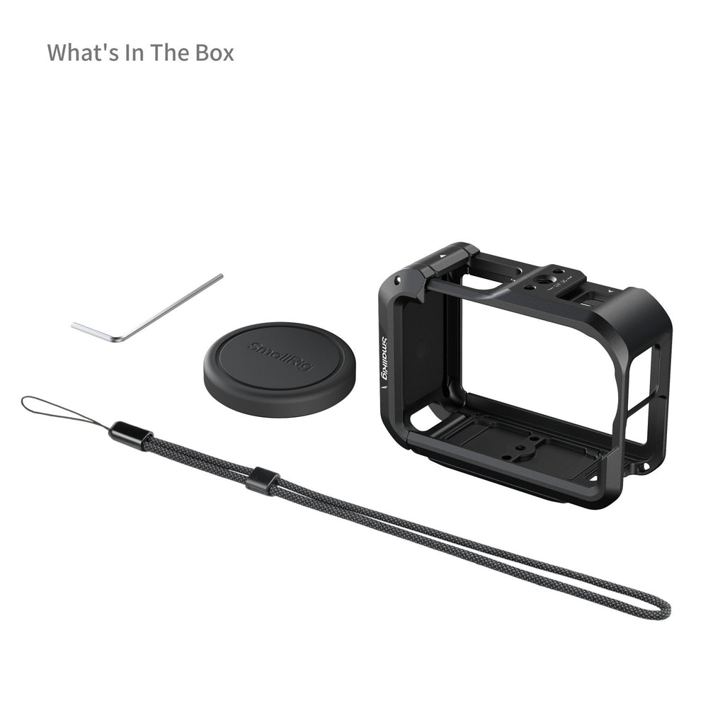 SmallRig Cage for DJI Osmo Action 6 (Advanced Edition) 5887 is designed specifically for the DJI Osmo Action 6. This full-cover metal cage provides robust impact protection while ensuring unobstructed access to all buttons and ports. Multiple expansion interfaces enable seamless accessory attachment, enhancing shooting efficiency. The kit includes the cage, a wrist strap, a silicone lens cover, and an Allen wrench.