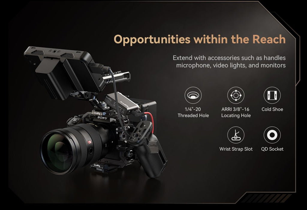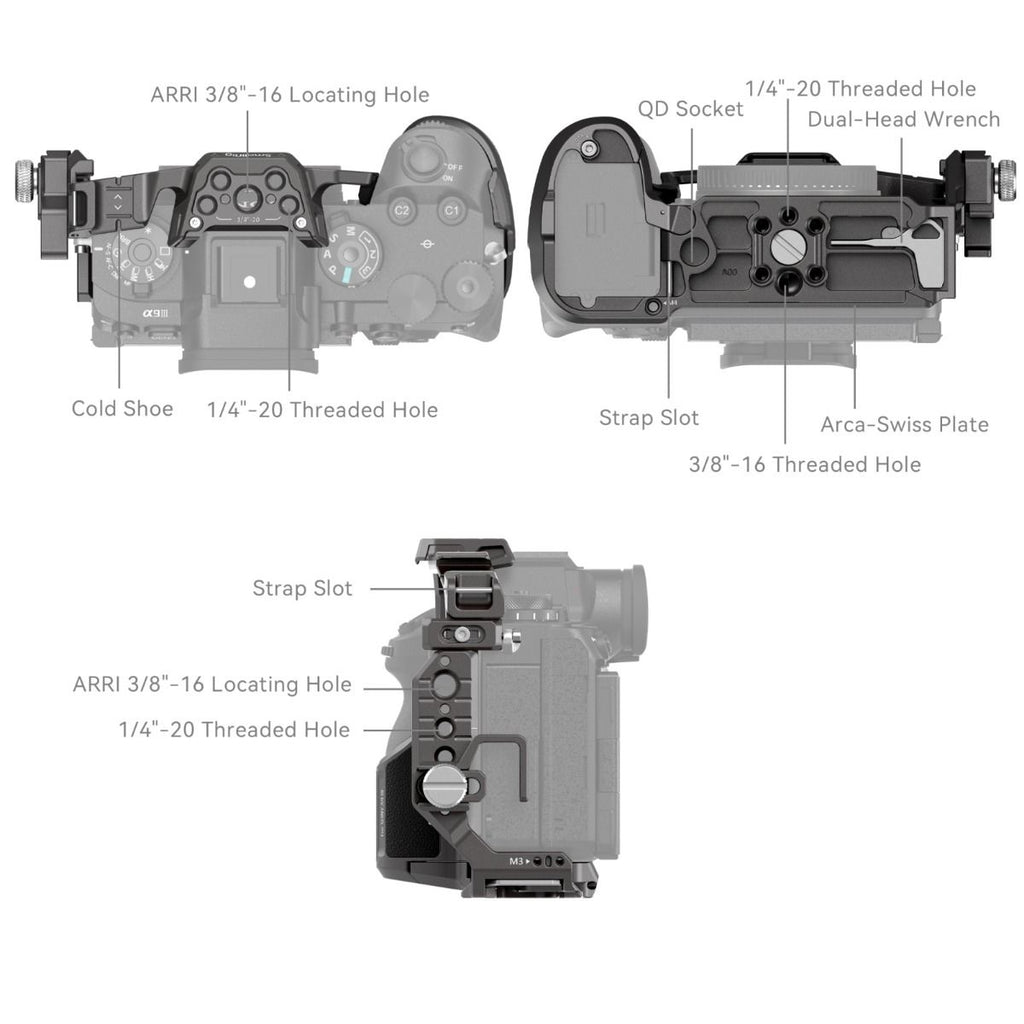 SmallRig Cage for Sony Alpha 9 III 4533 is designed to provide camera protection and expansion with accessories. Three-point anti-deflection locking system firmly secures Alpha 9 III via locating pins, a 1/4"-20 screw on the bottom, and an M2.5 screw on the left. The streamlined cage design ensures unobstructed button access, providing a more convenient usage experience. The dedicated "Rhinoceros" HDMI Cable Clamp secures the cables with thumbscrews protecting HDMI ports and ensuring stable data transmission. Multiple built-in mounting interfaces include 1/4"-20 holes and ARRI 3/8"-16 locating holes to attach a top handle (ID: 2165C) or side handle (ID: 4016), ARRI 3/8"-16 locating hole to expand the monitor support (ID: 2903B), cold shoes for microphone or LED video light, QD socket for QD shoulder strap. The built-in Arca-Swiss quick-release plate at the bottom is compatible with DJI RS 2 / RSC 2 / RS 3 / RS 3 Pro, DJI RS 2 / RSC stabilizer with quick-release plates, and Arca-Swiss quick-release plate (ID: 3154). The strap holes on the left and at the bottom of the cage are compatible with the hand strap (ID: 3848), shoulder strap (ID: PSC2428), and other accessories. Besides, a magnetic wrench at the bottom of the cage is accessible at any time for easy disassembly and assembly.