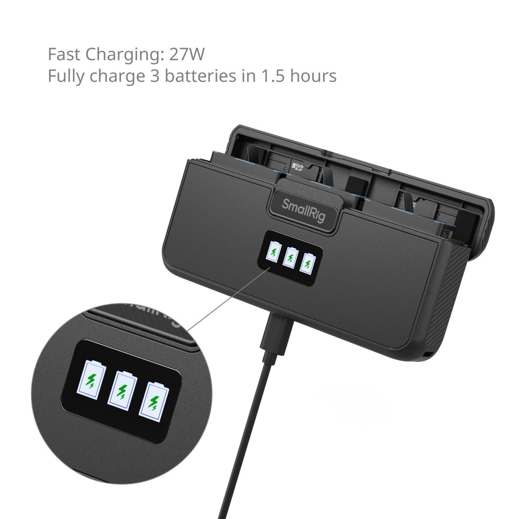 SmallRig Camera Battery Charger for GoPro 9/10/11/12 5418 has robust PD 27W ultra-fast charging, which enables simultaneous full charging of three batteries, delivering efficient and powerful charging capabilities.