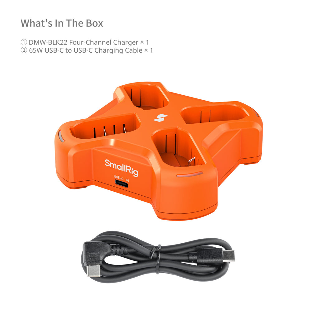 SmallRig Four-Channel Camera Battery Charger for DMW-BLK22 5748 is a high-efficiency, high-power charger designed for DMW-BLK22 batteries. With a 45W max input and full protocol compatibility (including 5V/1A adapters), it intelligently queues charging based on the adapter’s power.