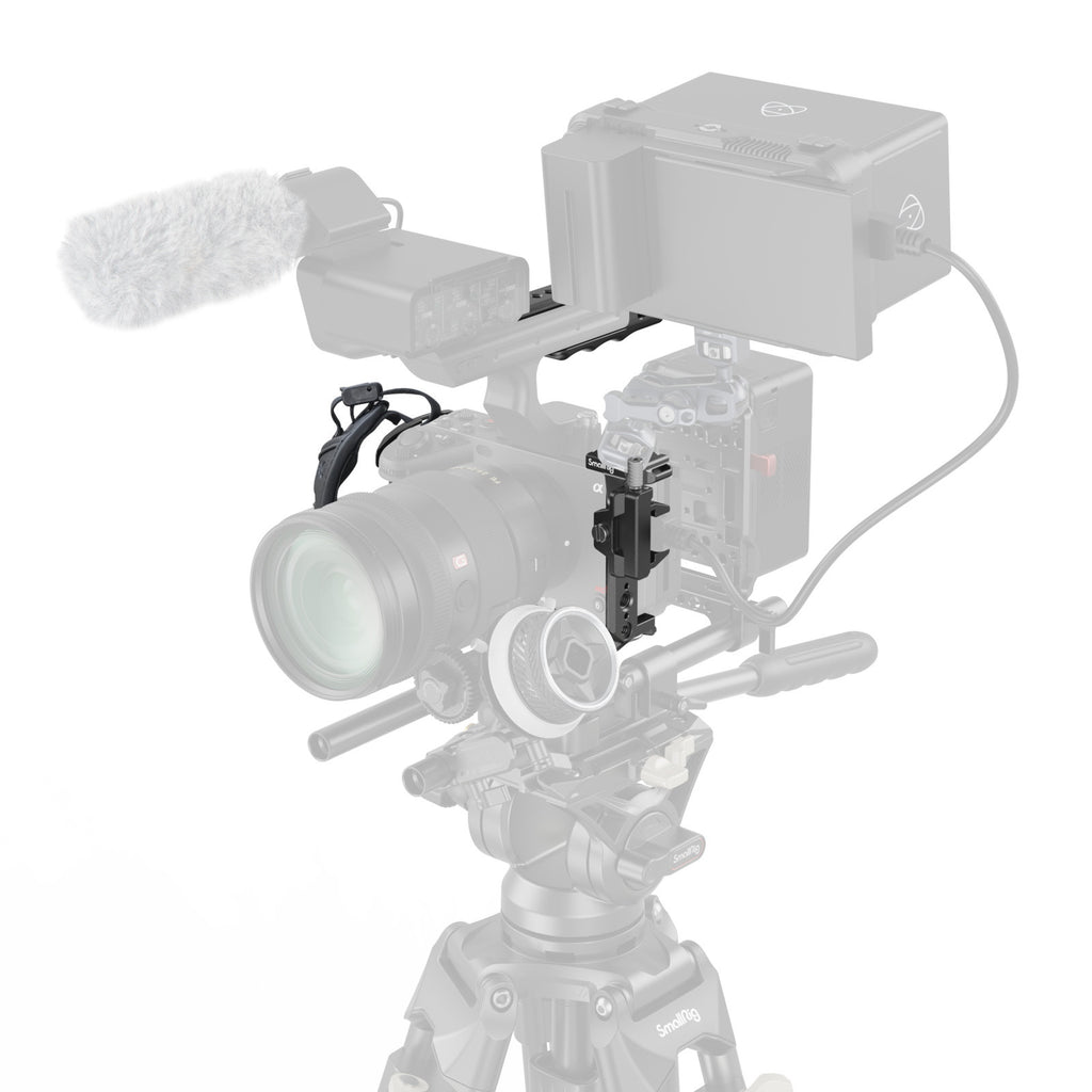 SmallRig Handheld Cage Kit for Sony FX30 / FX3 4184B is designed to protect camera and provide accessory mounting points, hence improved shooting experience. The kit includes a cage, a HDMI cable clamp, a XLR handle extension rig and a hand strap. Among them, the extension is ergonomically designed for comfortable grip and equipped with accessories mounts; Hand Strap 3848 helps increase stability and safety; the dedicated HDMI cable clamp protects interfaces to ensure stable signal transmission. Overall, the kit comes with 1/4"-20 threaded holes for Magic Arm 3873 for monitor; ARRI 3/8"-16 locating holes for Monitor Mount 2903B, Side Handle 2914; cold shoe mounts for microphone, LED light; 1/4"-20 locating holes at the top-left quarter and on the left side for Rod Clamp 3598 for follow focus; and a NATO rail on the left side for Side Handle 2187B. An Arca-Swiss quick release plate at the bottom allows for quick switch between tripod mode and handheld mode. Besides, a slotted screwdriver is included for easy assembly and disassembly.