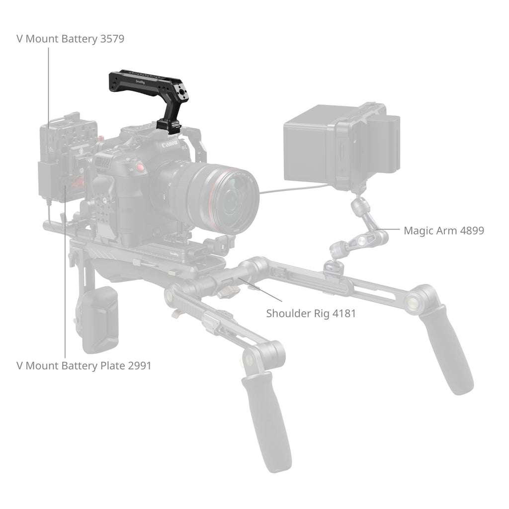 Equipped with multiple mounting interfaces, including 1/4"-20 threaded holes & locating holes, an H18 quick release cold shoe mount, and 3/8"-16 ARRI locating holes, this handle seamlessly integrates with accessories such as the monitor mount (ID 2903B), magic arm (ID 4194), and video light (ID 4660), ensuring versatility for various shooting scenarios..