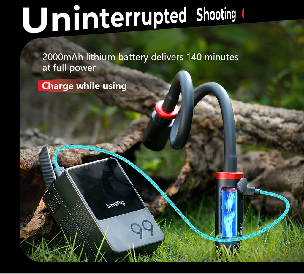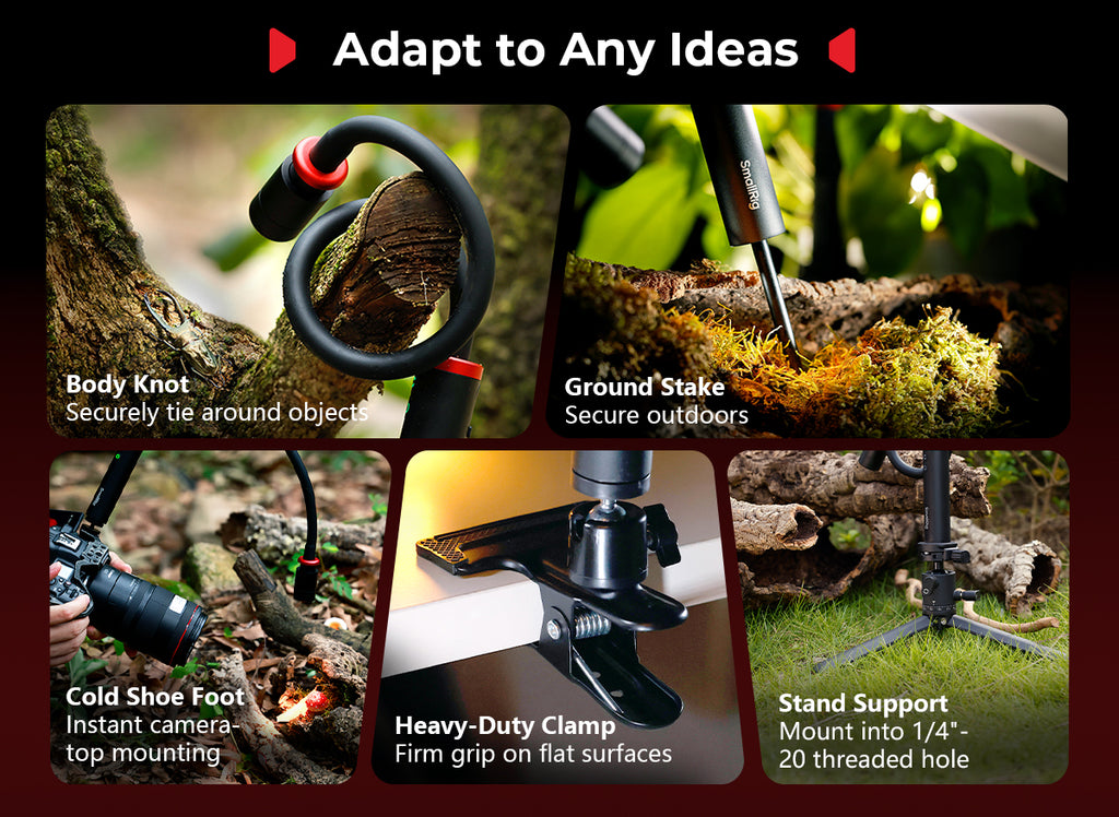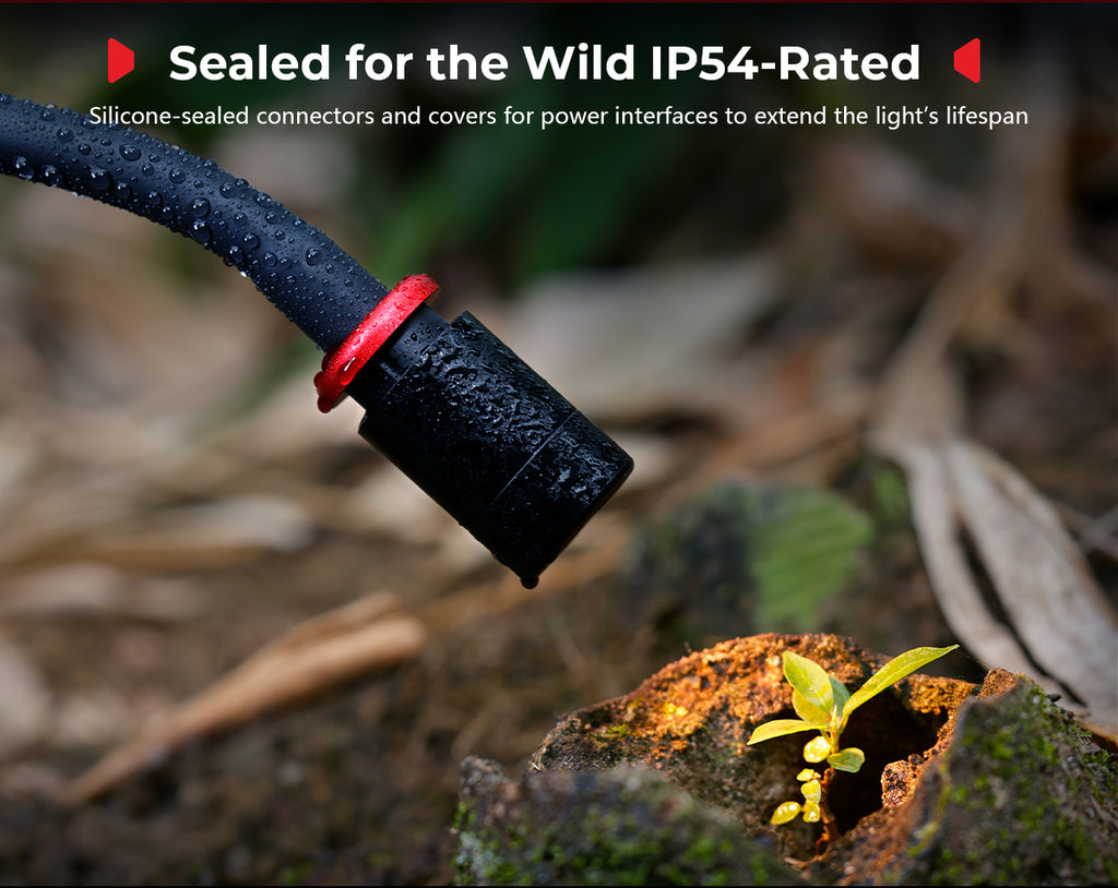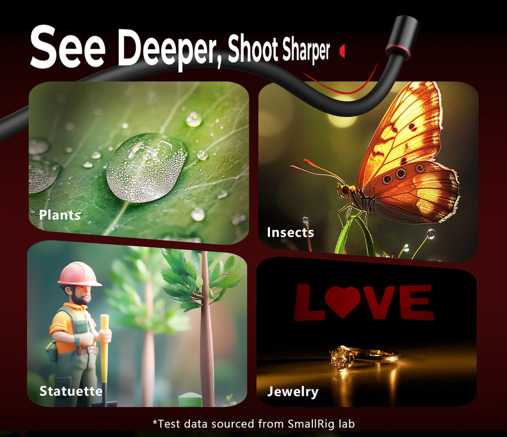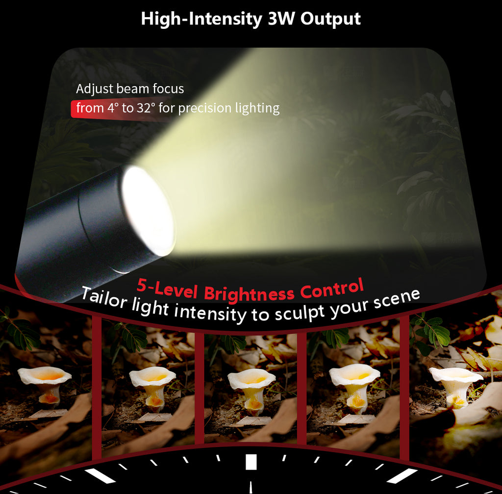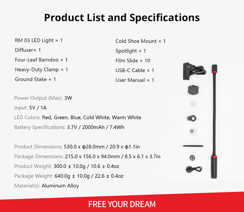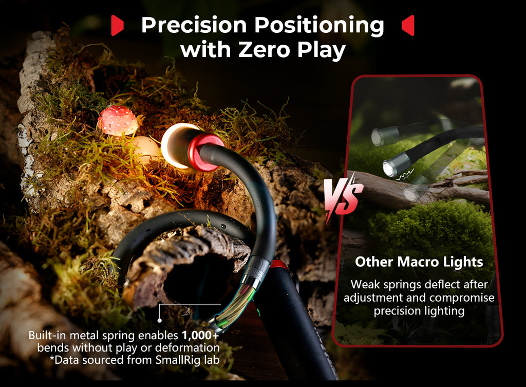 The RM 03 is a specialized LED light designed for macro photography. Its sturdy built-in metal spring allows for effortless adjustment of lighting angles. It comes with light control accessories, including a diffuser and a four-leaf barndoor, along with versatile mounting options such as a heavy-duty clamp and a ground stake, providing unmatched flexibility. With an IP54 rating for weather resistance and five powerful 3W LED lamp beads that support multi-color output, the RM 03 inspires limitless, long-lasting (up to 140 minutes of runtime) creativity in macro photography.