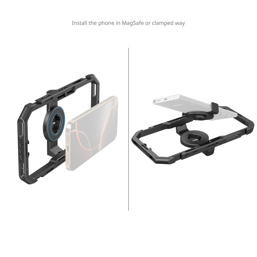 When using a mobile phone with MagSafe for stable static shooting, you can attach the phone directly to the MagSafe base on the cage. If you're using a phone without MagSafe or shooting dynamic scenes, you should use the included phone clip to secure the phone before shooting.