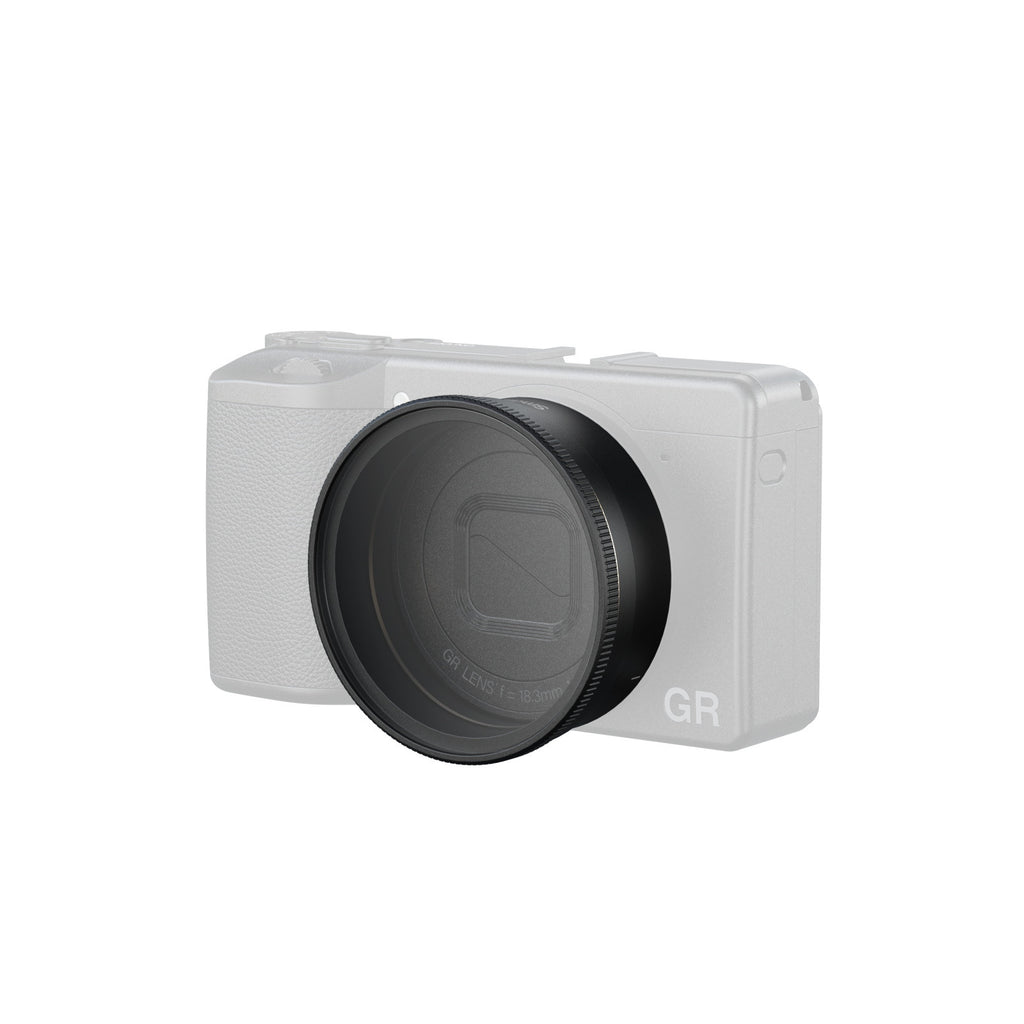 For added protection, a custom silicone protective cap is included to shield both the filter and sun hood during storage. The matte black finish and gold accent ring are meticulously designed to complement the GR IV's aesthetics. This attention to detail ensures the camera retains its sleek profile and style, all while benefiting from uncompromising professional protection.