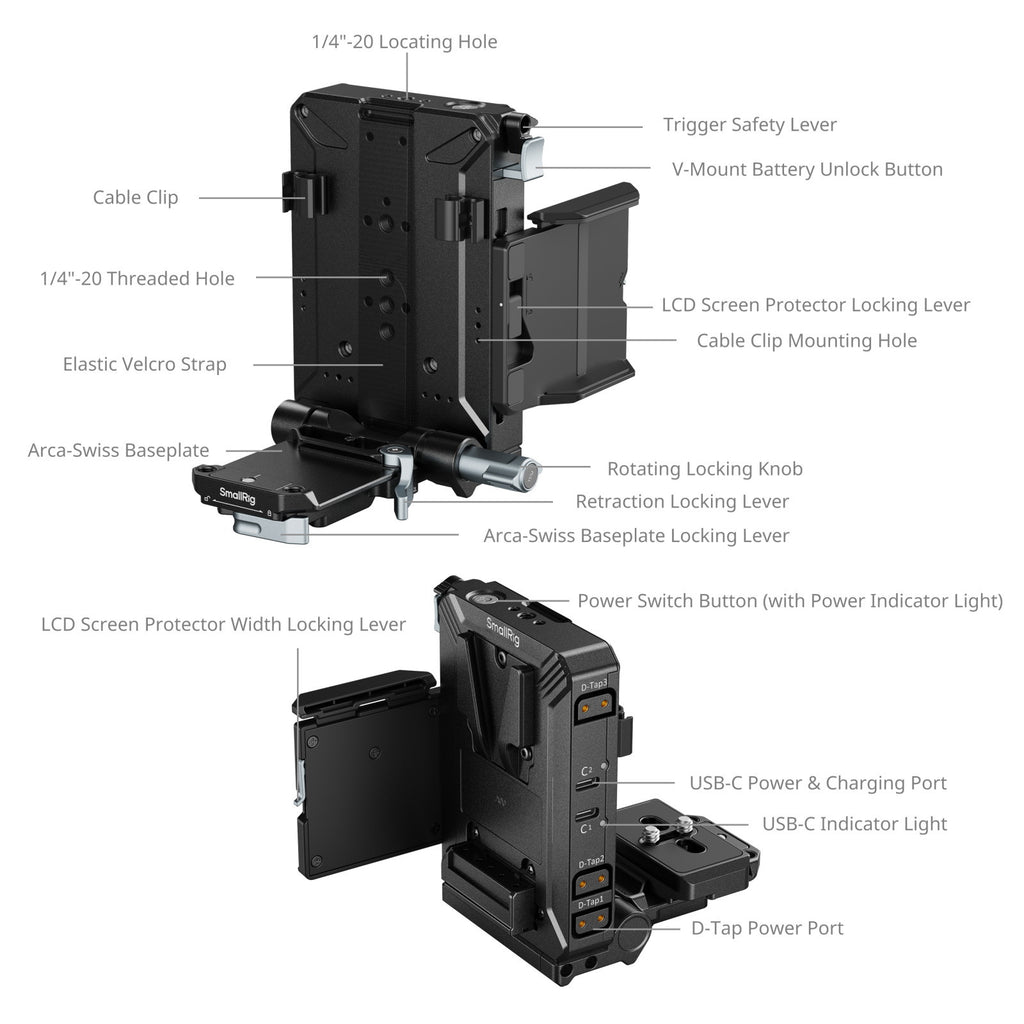 1. When using the LCD screen protector, the battery plate can accommodate V-mount batteries up to 80mm / 3.1″ in width. Compatible SmallRig V-mount batteries: 3579B / 4871 / 4872 / 3580B / 4929 / 4930 / 4292 / 4974 / 4608 / 4984 / 3581B / 4293.