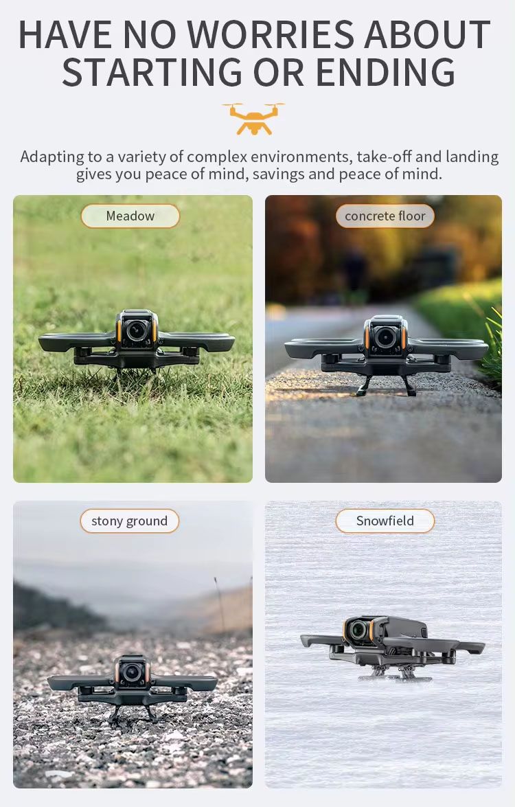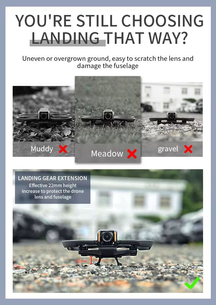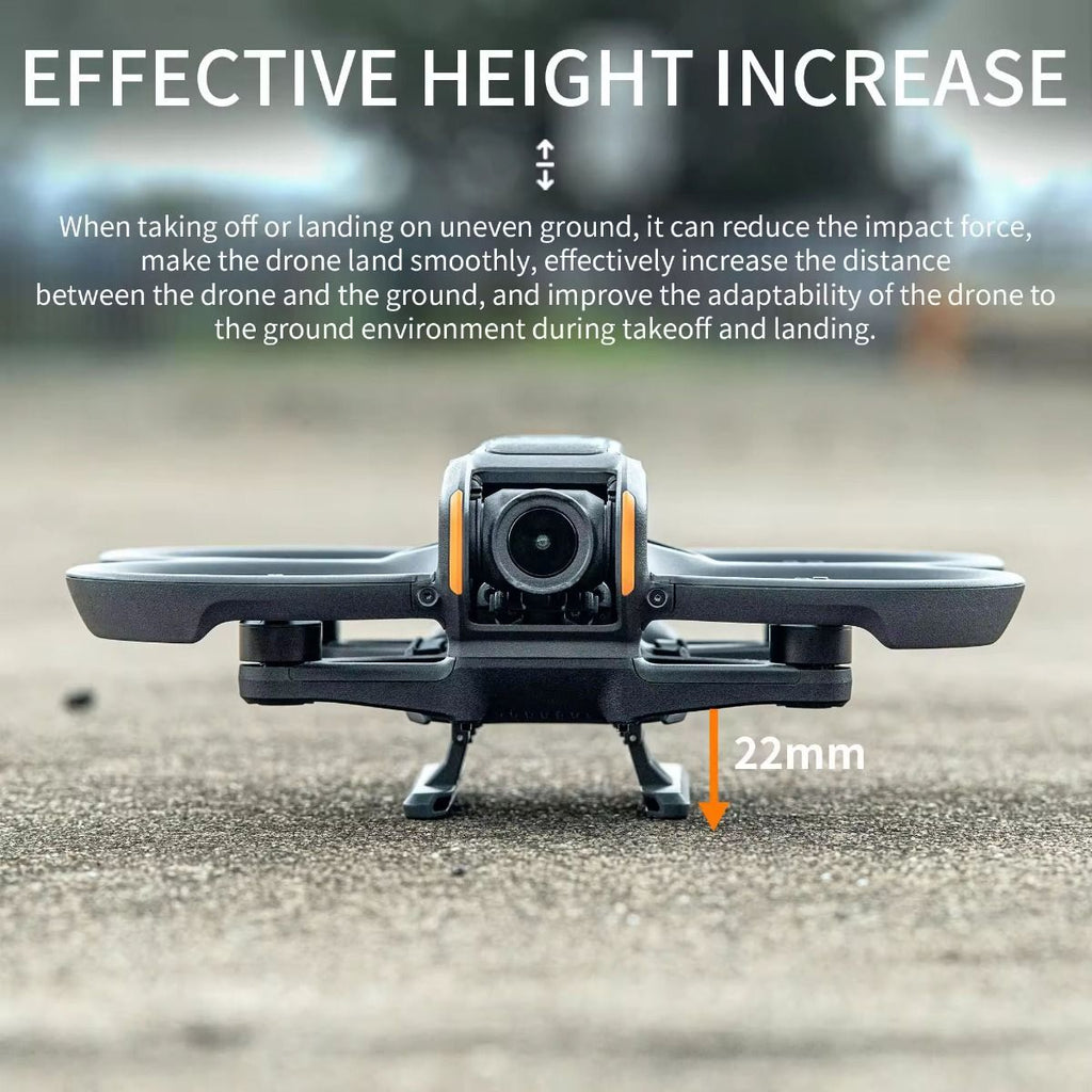 - It can effectively increase the distance between the drone and the ground by 22 millimeters. When AVATA 2 takes off or lands on uneven ground, it can reduce the impact force, make the drone land smoothly, and protect the body, sensors, and pan tilt camera of AVATA 2 to prevent damage. It can prevent ground debris or water stains from dirtying or damaging the drone body, gimbal, and propeller.