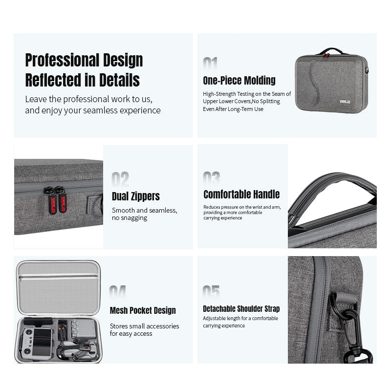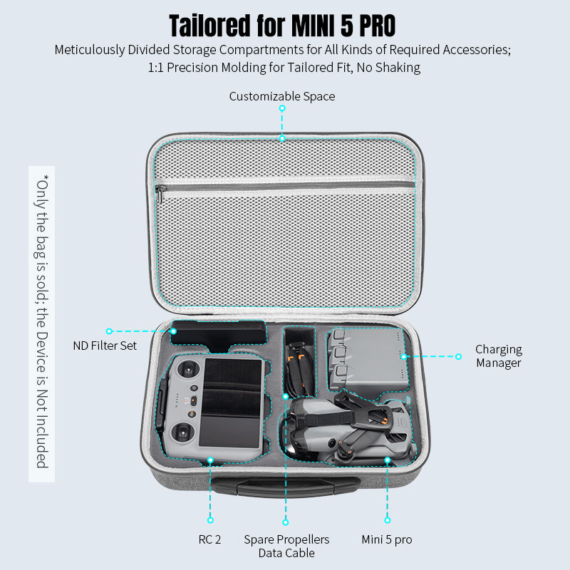 Designed specifically for DJI Mini 5 Pro and its accessories including RC 2 controller, ND filter set, charging manager, spare propellers, and data cables