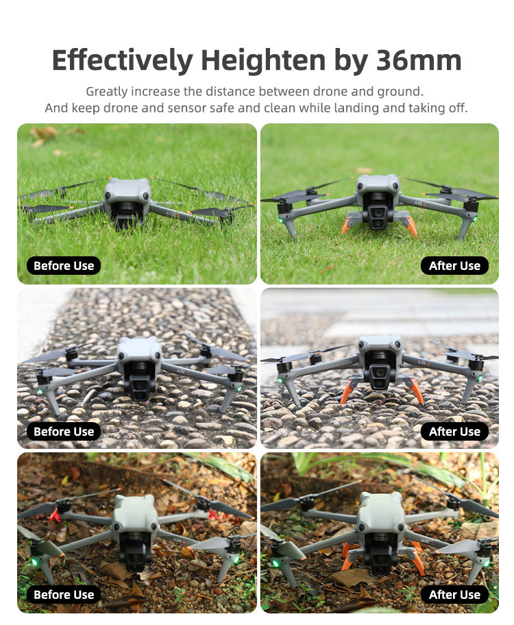 - Effectively Heighten by 36mm. Greatly increase the distance between drone and ground. And keep drone and sensor safe and clean while landing and taking off.