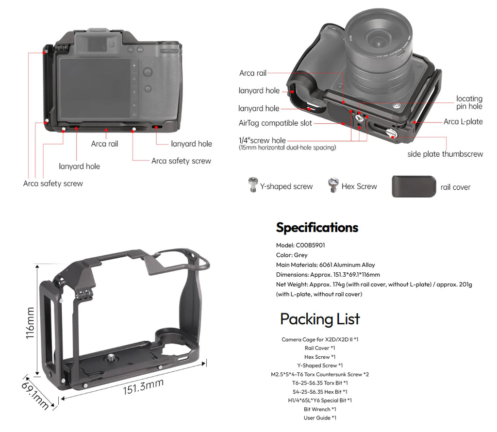 Net Weight: Approx. 174g (with rail cover, without L-plate) / approx. 201g (with L-plate, without rail cover)