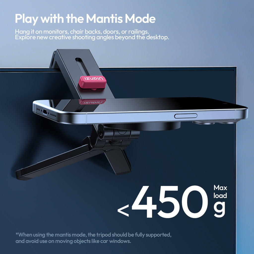 Easily clamp and stabilise your phone in seconds with the push-down button design—no slipping, no shaking. The built-in tripod unfolds for steady shots on any surface, or folds into a portable selfie stick for travel and handheld use. With Mantis Mode, hang it on monitors, chair backs, doors, or railings for creative angles beyond the desktop. Compact, pocket-sized, and ready for work, travel, or everyday use.