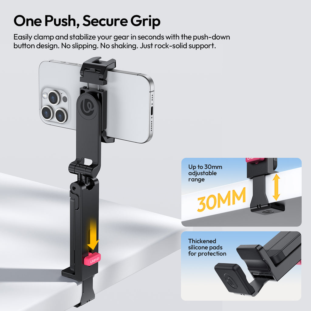 - One Push, Secure Grip — Easily clamp and stabilise your gear in seconds with the push-down button design. No slipping. No shaking. Just rock-solid support.