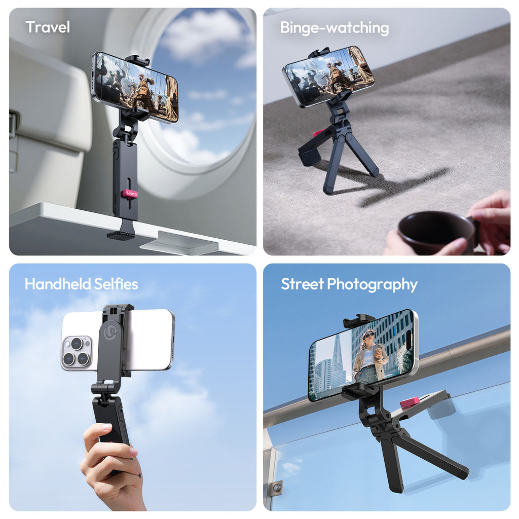 - Tripod or Selfie Stick — Unfold the built-in tripod legs for rock-solid stability on any surface. Fold them back in, and you’ve got a portable selfie stick ready to move when you do.