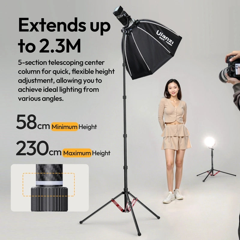 - Extends from 58cm to 230cm with a 5-section telescoping centre column