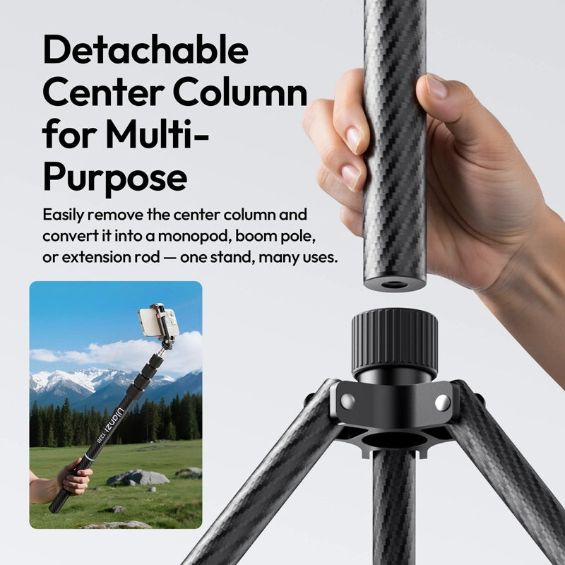 - Detachable centre column converts into monopod, boom pole, or extension rod